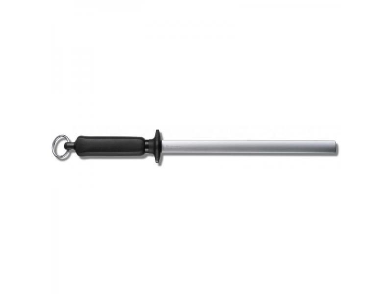 Brúska Victorinox na kuchynské nože s oválnym brusivom vyrobeným z priemyselného diamantu, plastovou rukoväťou a krúžkom na zavesenie. Dĺžka brusiva 23 cm.