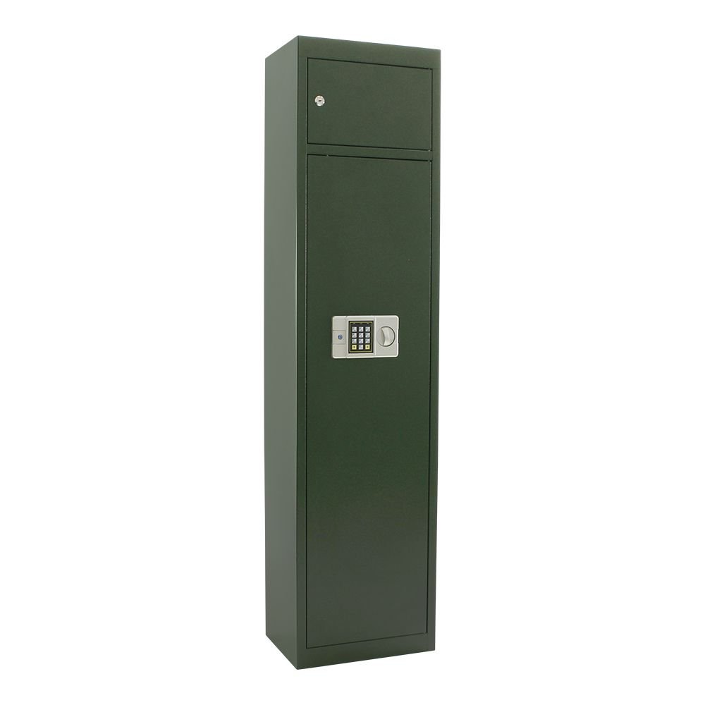 Ide o kvalitný trezor na uschovanie 5 dlhých zbraní, ktorý stráži bezpečný elektronický zámok. Pre prípad núdzového otváranie je možné trezor otvoriť pomocou kľúčov, ktoré sú súčasťou balenia. Zámok je napájaný pomocou 1,5 V AA batérii. Vnútorná časť dverí patrí držiaku na zavesenie čistiacich potrieb pre zbrane. V hornej časti trezora nájdete aj samostatne uzamykateľnú schránku na uschovanie napríklad streliva, dokladov alebo iných pomôcok. Nechýbajú ani vopred pripravené otvory na ukotvenie trezora. Materiál na upevnenie trezora a kľúče sa nachádzajú vo vnútri trezora. Batérie nie sú súčasťou balenia.